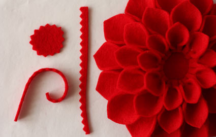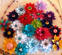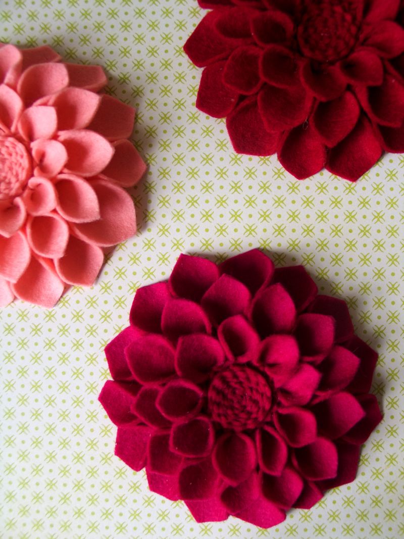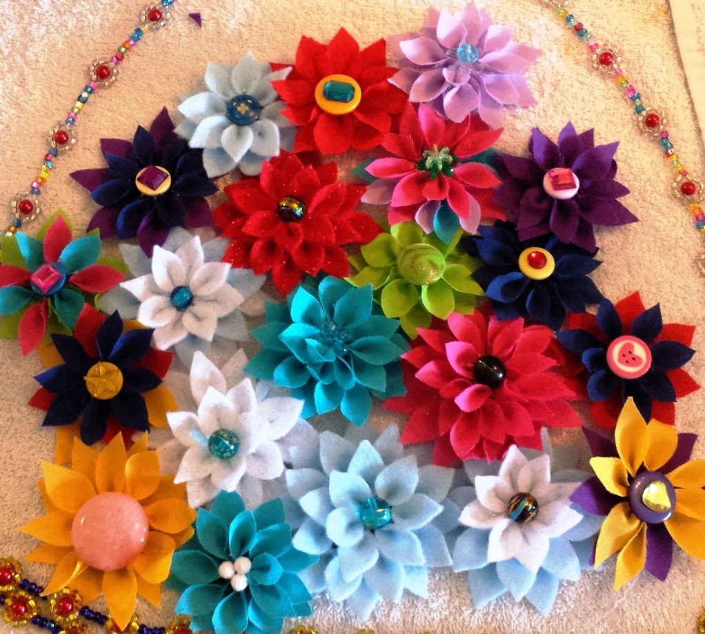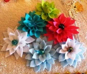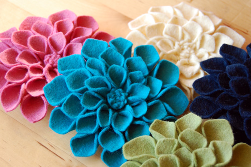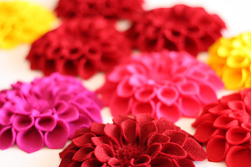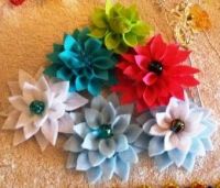 Here are some examples of felt flowers you may want to use as inspiration (with thanks to etsy, craftsy, and various blogs and tutorials I borrowed these beautiful pics from!). My apologies for showing only the dahlia-style flowers made from felt; when I tried to find more pictures of flowers like I had done, I wasn’t able to find any! Has nobody else thought of making felt dahlias…NOT out of felt? Not as far as I can figure! In any case, so endeth my first long-winded tutorial on how to make fabric dahlia-or poinsettia style flowers. Good luck, and let me know if you have found this tutorial useful!
