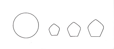 - Choose a backing colour for your flowers; the backing circle (mine were about 2″ in diameter) can sometimes be seen through the petals, depending on the fabric used for the petals. I used felt for some stability and decided on some green and some white backs. Cut out as many backing circles as you want flowers. I won’t insult your intelligence, dear readers, by giving you exhaustive instructions on how to cut a perfect circle, but simply mention that there’s no need to break out the protractor if you take the time to go on a five-minute treasure hunt through your own home. Cups, bowls, jar lids, buttons, you name it; they’re all round. Find the size that best fits what you need and trace its shape onto some felt backing, then cut out. If it helps, here is a template that will give you an idea of the relative sizes of petals and the backing circle:
