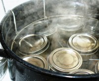 While you don’t need to sanitize the jars prior to filling them, they do need to be washed in hot, soapy water so the jars are clean and hot, and less likely to crack when you put boiling hot fruit in them. I usually like to be safe rather than sorry, so I put my freshly washed jars into my canning bath and boil them for a couple of minutes; that way they are squeaky-clean and hot by the time I’m ready to fill the jars. I take them out of the canner one at a time using rubber-tipped tongs to avoid chipping the glass.