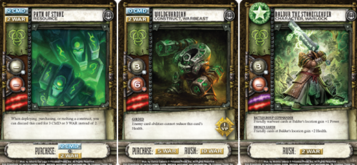 So, yeah, normally not my type of game AT ALL. I’m more of a Pathfinder geek, where I get to roleplay a character I’ve spent time and effort to flesh out. High Command is none of that; with 386 cards in the basic box, there are a LOT of choices, but all of them are guided. You choose whether to play Warmachine or Hordes (see the two boxes above), and then choose one of several factions to play. Then based on that choice, you choose three of five warcasters/warlocks (if you’re playing Hordes) that will be your go-to guys, and a bunch of different cards are handed to you as your in-hand pile and your pick-up pile. The centre of the table is reserved for the four location cards where the battles between the factions take place. You also have to make space on your side of the table for two different types of discard piles depending on what step you’re on in the game, and another space to collect the cards that have Victory Point values to you, which you add up at the end of the game.