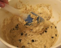 4. Stir banana mixture into dry ingredients just until barely mixed together (DO NOT OVER-MIX). Stir in chocolate chips.