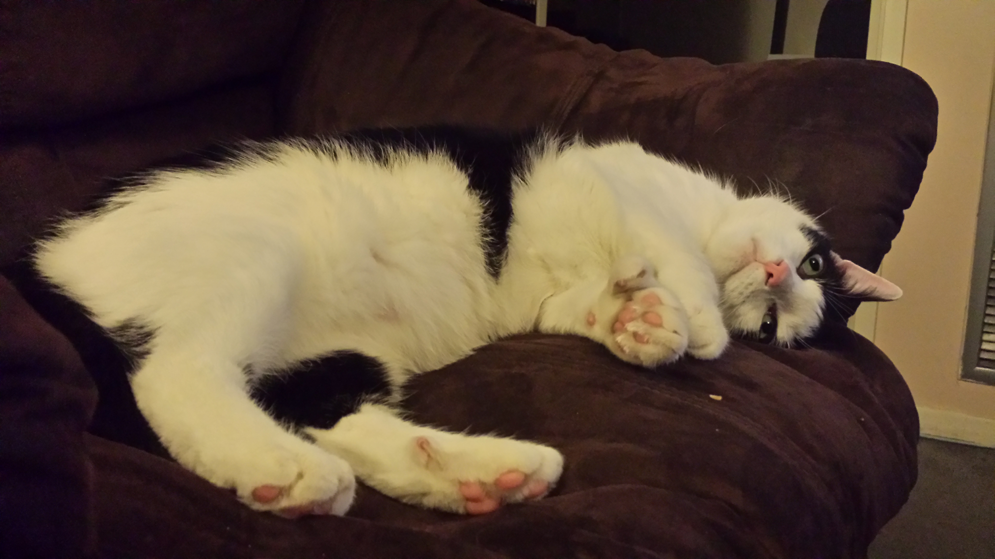 This is our Recycled Polydactyl KittyPuss, Hexamorph. He looks dead or Zombified here, and it kind of freaked me out, as he stayed that way for a full 5 minutes, unblinkingly staring into the abyss.