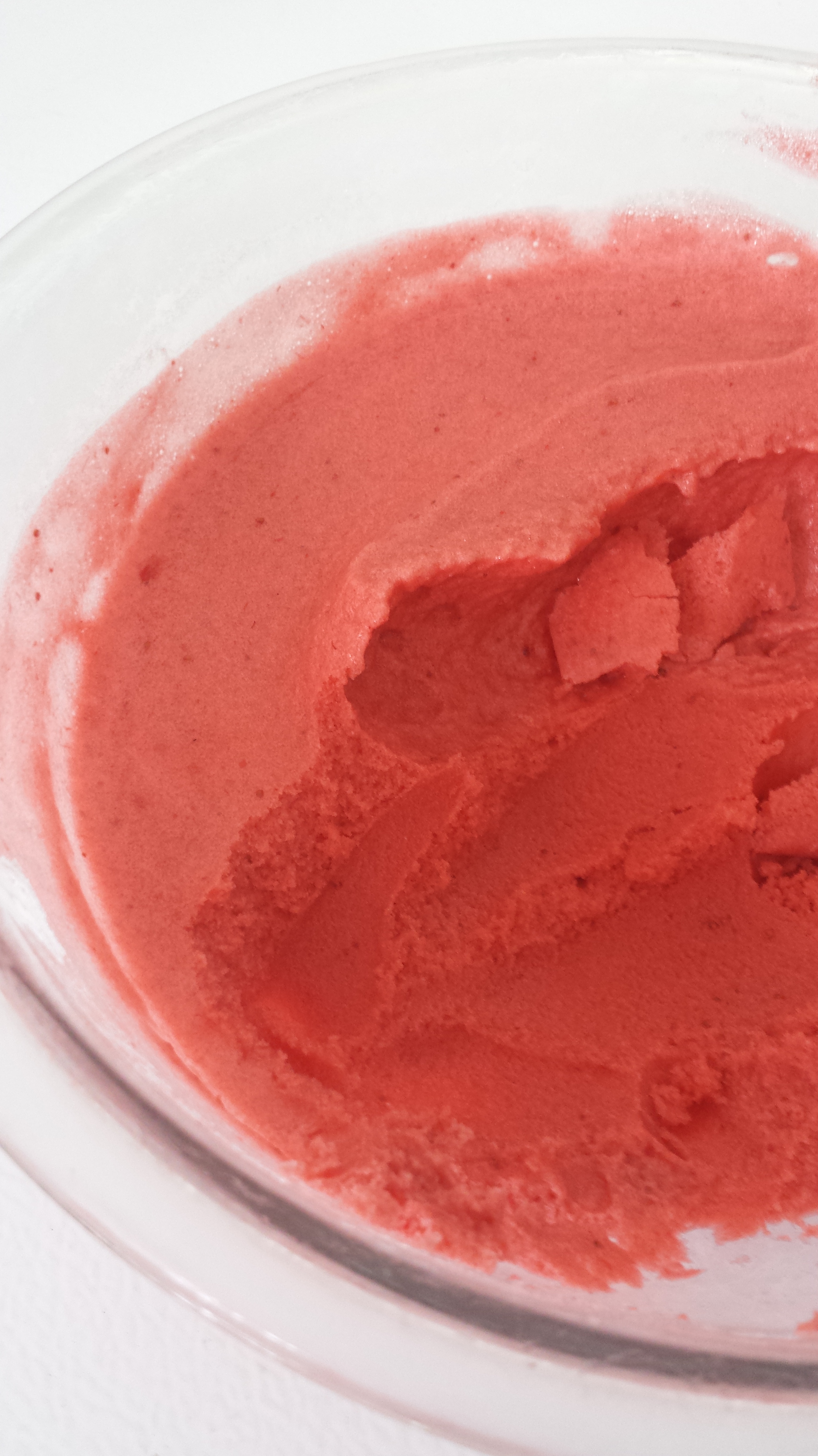 The recipe that captured my attention and made me do a little happy-dance last week? Homemade sorbet. Specifically, strawberry sorbet, made with delicious strawbs picked and flash-frozen at the peak of ripeness last summer. I usually only make sorbet in the summer months, as I like to use fresh berries that I’ve picked myself in June and July. However, I happened to find a bag of frozen strawberries just forlornly lying about in my deep freeze while I was looking for dinner ingredients, and BOOM! went the craving for a little taste of summer.