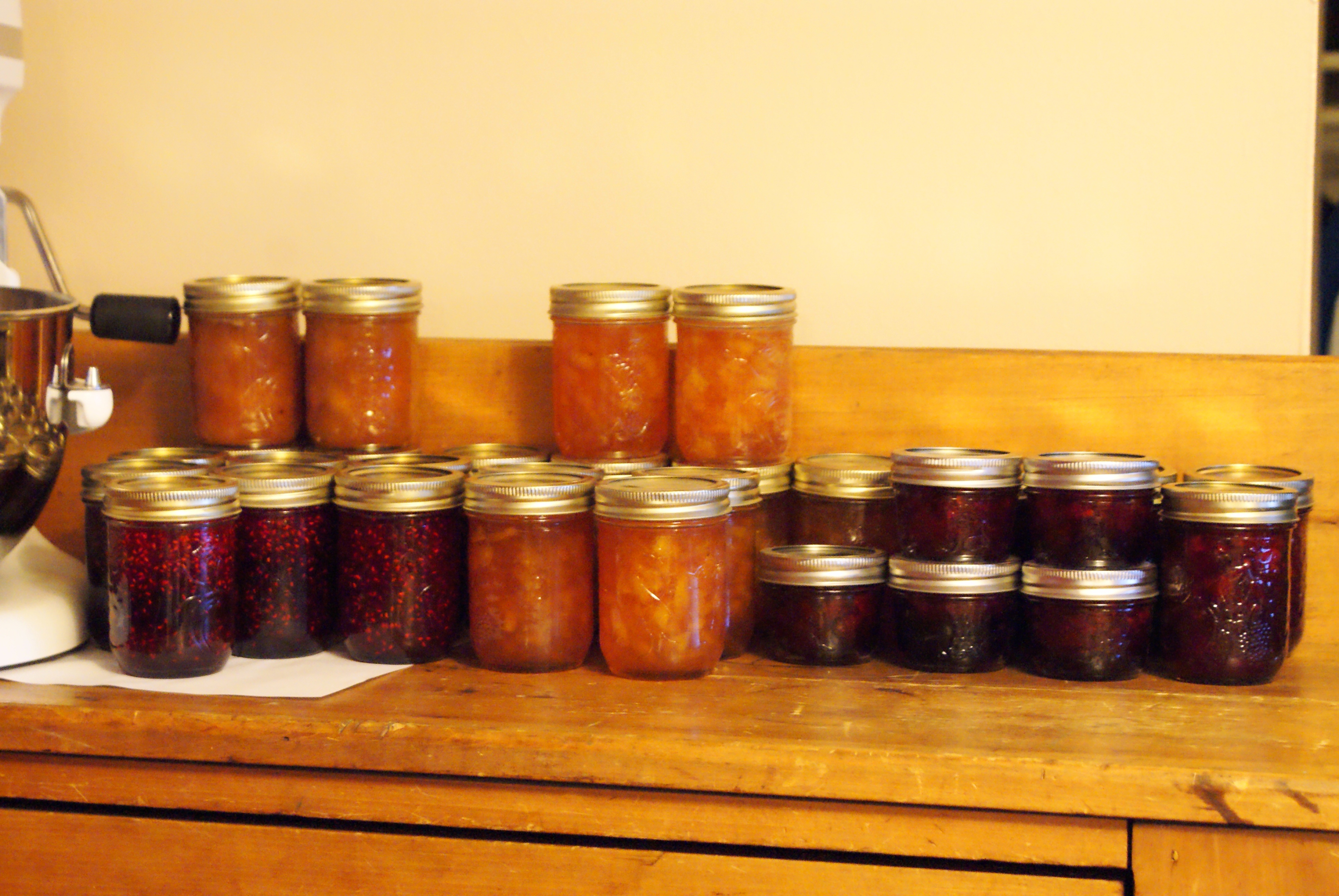 This fruit sauce (“sawse”) was a happy accident for us; fifth of the six jams we did over the course of one weekend, we got a little silly from tiredness and started adding whatever fruit leftovers we had left, not to mention a few things that just sounded like they would pair well together. This sauce is stunningly delicious over vanilla ice cream or plain pound cake, and makes a delicious addition to smoothies.