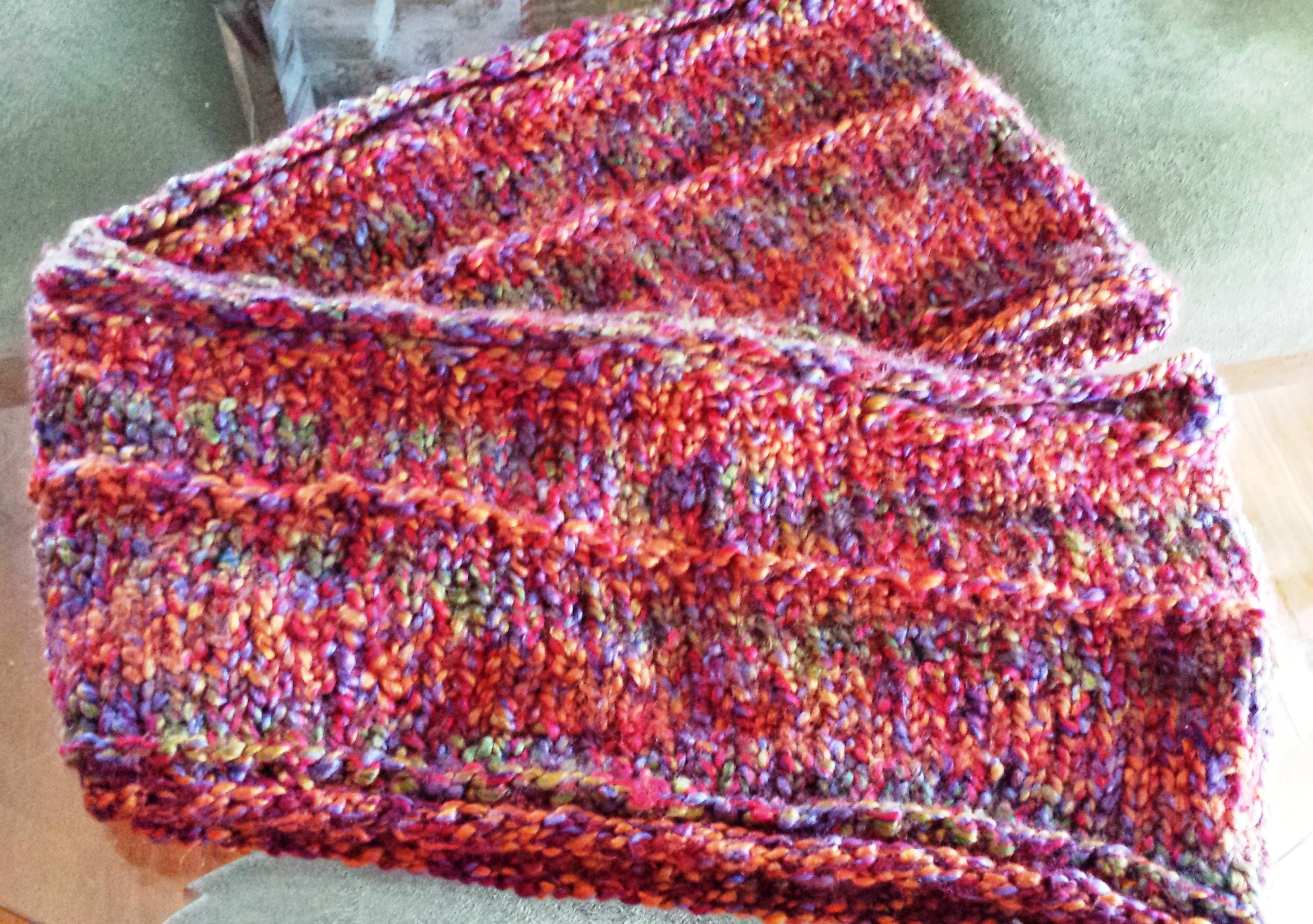It was originally going to be a cowl, but I used reallllly large circular needles, and put on far too many stitches when knitting in the round, so it’s turned into an infinity scarf, but I’m totally fine with that. It’s also wide enough that if I need to use it as an impromptu head covering, it can stretch to fit my cabeza :o)