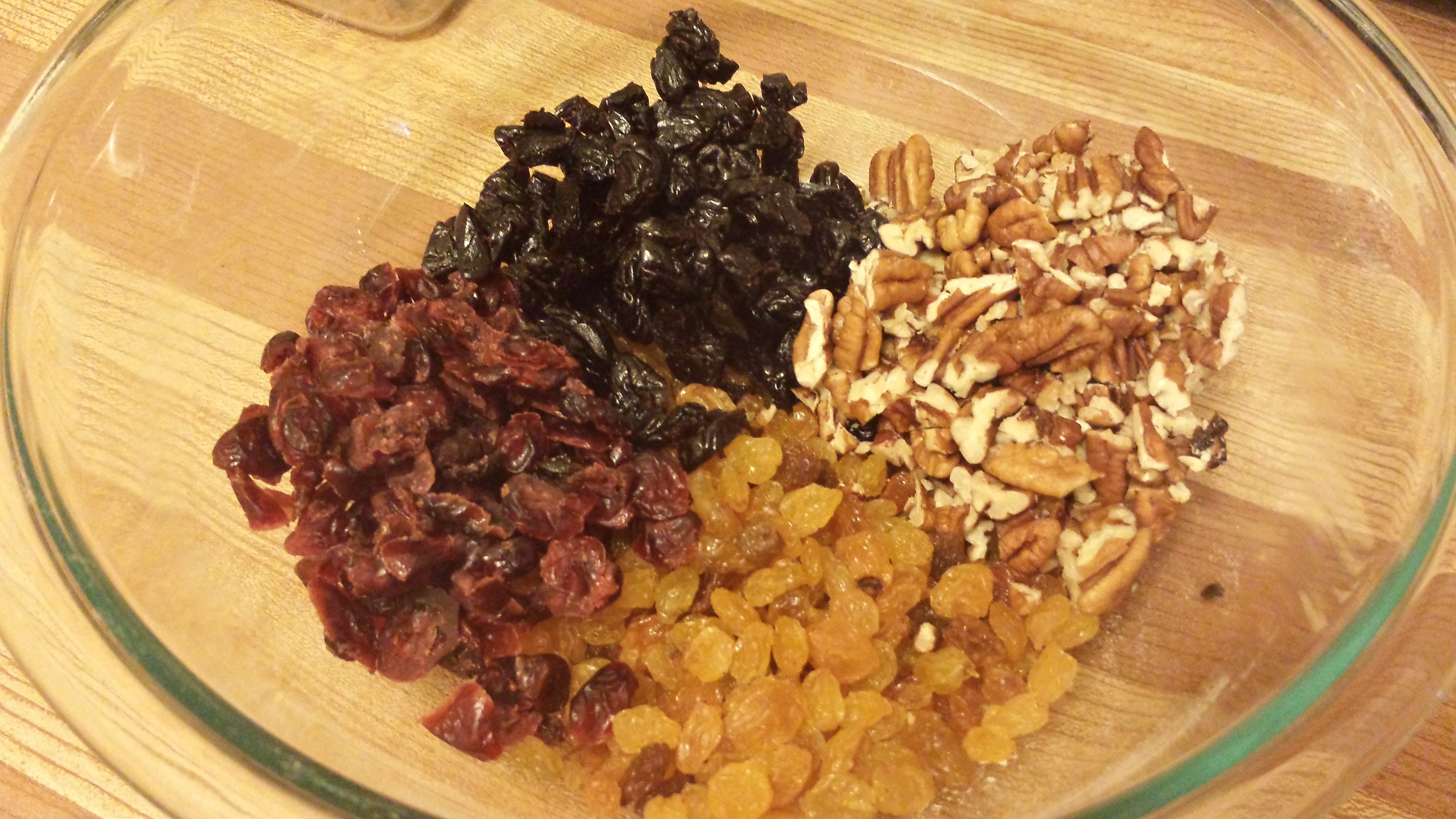 - 2 cups dried fruit/nuts, chopped (I used ½ cup golden raisins, ½ cup dried cranberries, ½ cup dried cherries, and ½ cup pecans)