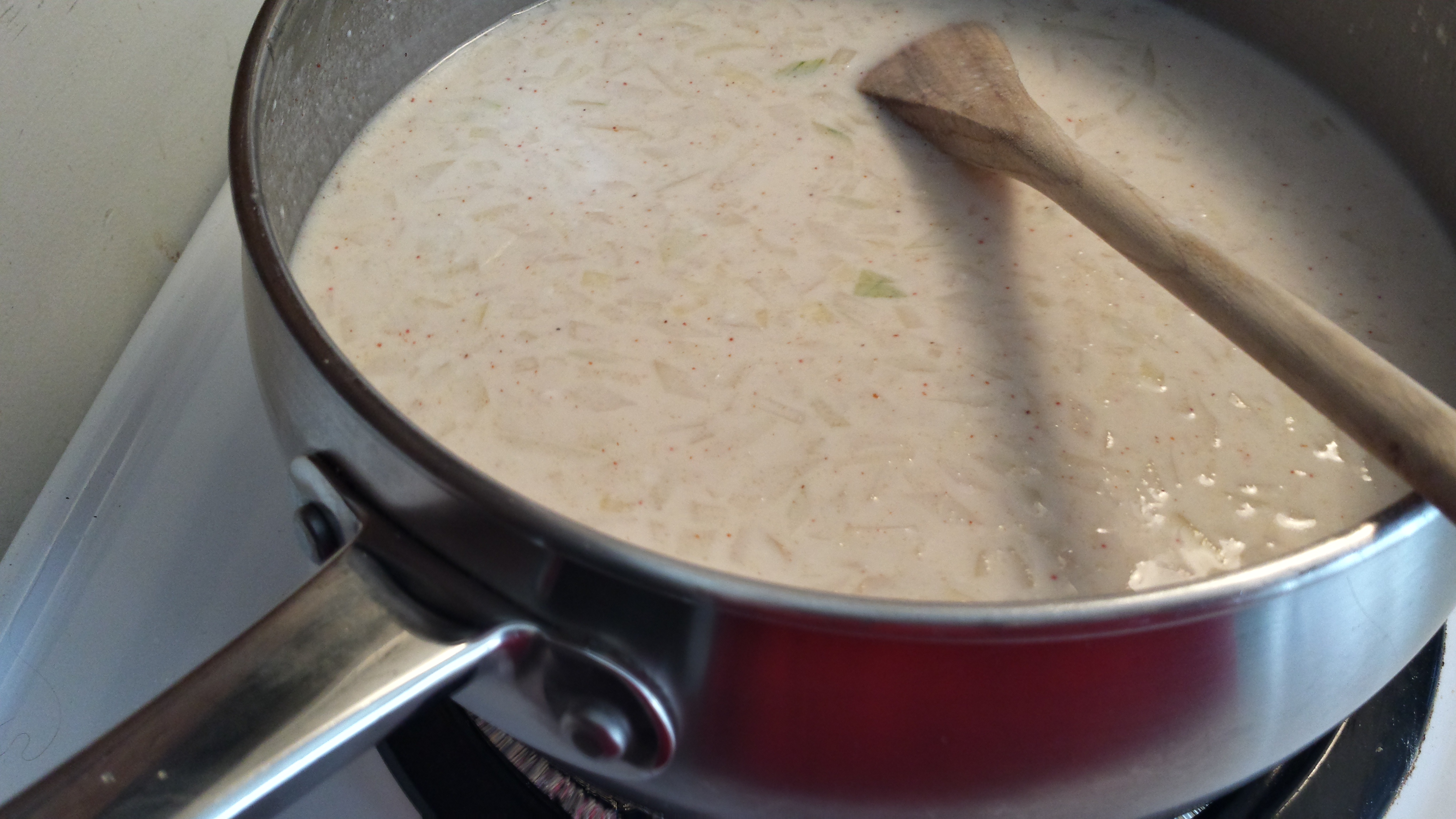 Thirdly, as I mentioned above, I would not use the bay leaf at all (and didn’t; the one change I made to my version). Too much like sucking on an evergreen tree to my taste, thankyouverymuch. A traditional bechamel sauce uses a small amount of nutmeg, which I presume AB was substituting with the bay leaf (bay leaves and onion *do* go well together, I admit). So I would remove it altogether, or put in nutmeg instead.