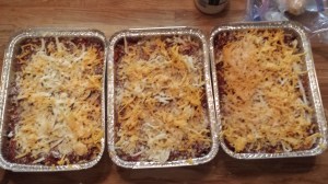 The recipe below will make one very large pan lasagna with a little left over, or several smaller pans which you can freeze prior to baking, and then defrost overnight in the fridge and bake off at 375 degrees F for an hour and a half. Feel free to omit the ricotta filling in between the layers if it doesn’t float your boat; as I said above, it’s an extra step that we did simply because we had some extra filling available.