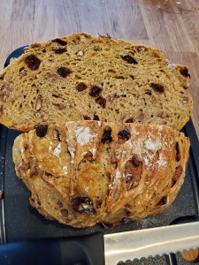 - In larger bowl, whisk flour, salt, yeast and spices together, stir in nuts and cranberries and mix until combined. Pour wet mixture over dry mixture and stir until all of the liquid has been absorbed into the flour. Dough should be smooth and sticky. [Note: I’ll admit to “cheating” a little and kneading the dough in the bowl for a few seconds to ensure it’s all sticking together properly].