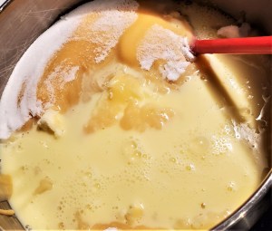 - Combine all ingredients into a large, heavy-bottomed saucepan; turn heat to medium-low and affix candy thermometer to side of pan.