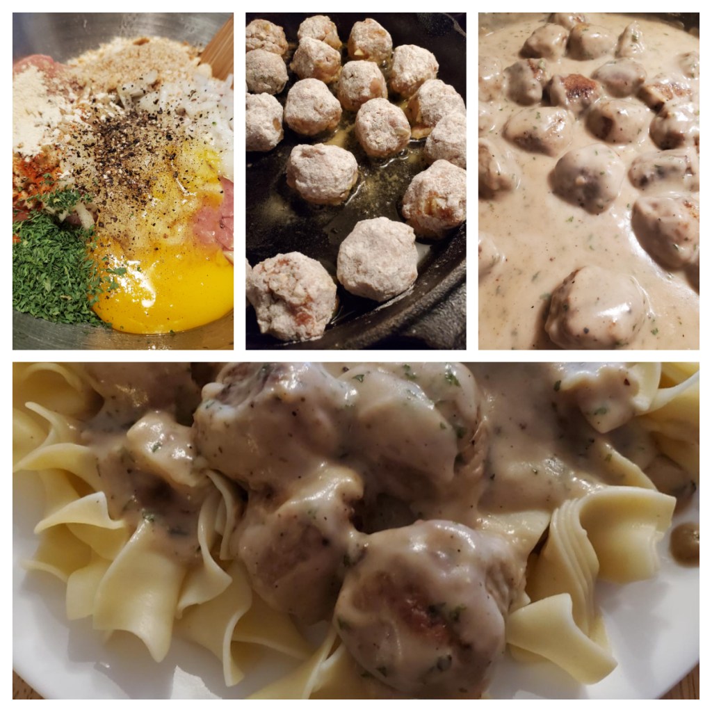 As per the link above, meatballs are virtually a global recipe, in that literally dozens of countries and cultures have their own version. I’ve seen and made my own meatball recipes many different ways, with many different ingredients. To that end, this Swedish version is simply an easy to make, delicious recipe for homemade meatballs smothered in gravy, served over egg noodles. If you’re trying to lower your red meat intake, it’s equally as yummy made with ground chicken or turkey, as I did here, and it goes just as well served over mashed potatoes as noodles; if you want to reduce the calorie count even more, try serving it over riced cauliflower and a nice side salad.