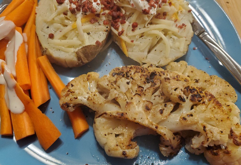 Once again, this is a meat analog that tastes nothing like its carnivore brethren. But in this case, the “steak” in the title has less to do with the plant-based ingredient substitution, and more to do with its general plank-like shape and how it is cooked. With a (microwaved) loaded baked potato and some fresh veggies, this meal was on the table in 20 minutes from start to finish. Feel free to switch up the spices to something you may prefer more; cauliflower is very mild and can handle a vast array of flavours.