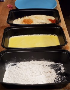 - Create your “dredging station”: place three containers side by side; place flour on the first, whisk together eggs, milk, salt and pepper in the second, and combine breadcrumbs, Parmesan, dried parsley garlic and onion powder, and paprika together in the third. Have a plate handy at the end of the dredging station to receive the prepared chicken breasts.