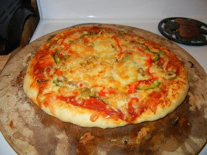 There are a number of ways to make a great pizza, and every way has its own merits depending on how you prefer your final product. I find that the tastiest ways that work for us are either baking on a pizza stone or in a cast iron pan. We’ve also just picked up some ventilated non-stick pizza pans which we are trying out to see if we like them, but since the jury’s still out on those, I’ll stick to my old standbys.