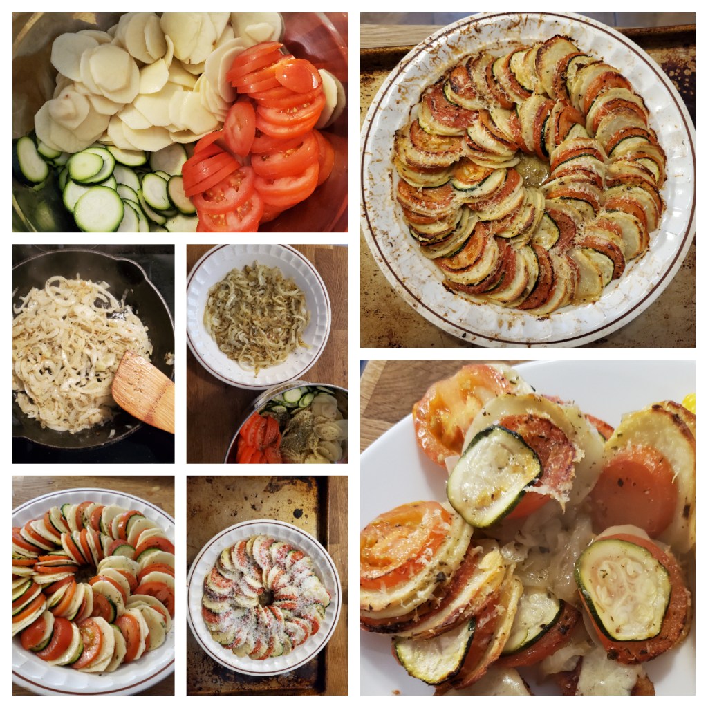 This delicate-looking casserole is best assembled using a mandolin slicer for thin, even slices of potato and zucchini (note: tomatoes are not a fan of mandolin slicers), but if you don’t have one, do your best to make the thinnest slices you can while keeping them of even thickness. This will ensure even cooking. Full disclosure, I misread the recipe and ended up slicing double the number of potatoes needed, so I doubled up the potatoes in the assembly, as they were super-thin. Turned out fine. Still had some left after the assembly; they made a delicious fry-up the next morning. No regrets.